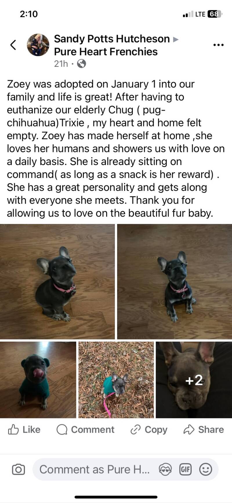 At Pure Heart Frenchies, we take immense pride in connecting loving families with our adorable French Bulldogs. Our testimonials reflect the joy and satisfaction our customers experience after welcoming a Frenchie into their homes. Many express how their new furry family members brighten their days with playful antics and affectionate nature. Clients often mention the seamless adoption process and the ongoing support they receive from our dedicated team. With each testimonial, it's clear that our Frenchies are not just pets but cherished family members that bring endless smiles and companionship. This heartwarming feedback inspires us to continue our mission of breeding healthy, happy Frenchies for families across York and beyond.